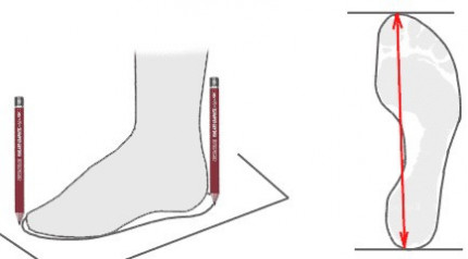 Под углом 90 градусов, лучше стоя, измерить длину стопы от пятки до большого пальца.